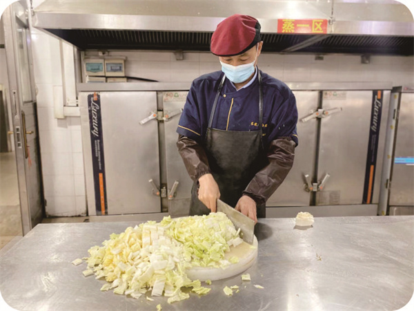 到崗的時(shí)候天氣正熱,工作量心里沒底,但他不動(dòng)聲色,跟著老廚師長(zhǎng)邊學(xué)、邊問、邊記,很快摸清了工作流程:每天按菜譜報(bào)所需菜量,驗(yàn)菜、洗菜、配菜,炒、煮、上菜,收飯桶,清理后廚。作息時(shí)間,早上5點(diǎn)就要到崗,下午7點(diǎn)以后才能休息。
