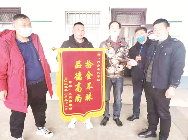 2月21日上午,乘客王玉偉將一面印著“拾金不昧、品德高尚”的錦旗送到內(nèi)鄉(xiāng)分公司副經(jīng)理白禪才辦公室。